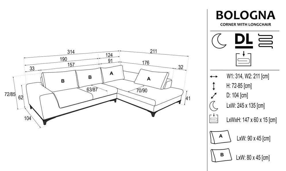 Designed for modern UK interiors, the Bologna corner sofa bed combines spacious seating with a practical sleeping function and integrated storage. Its universal corner design with a longchair offers flexibility of placement and everyday comfort, while the DL mechanism allows for smooth and effortless conversion when needed. Bologna is a balanced solution for daily lounging and occasional overnight stays.