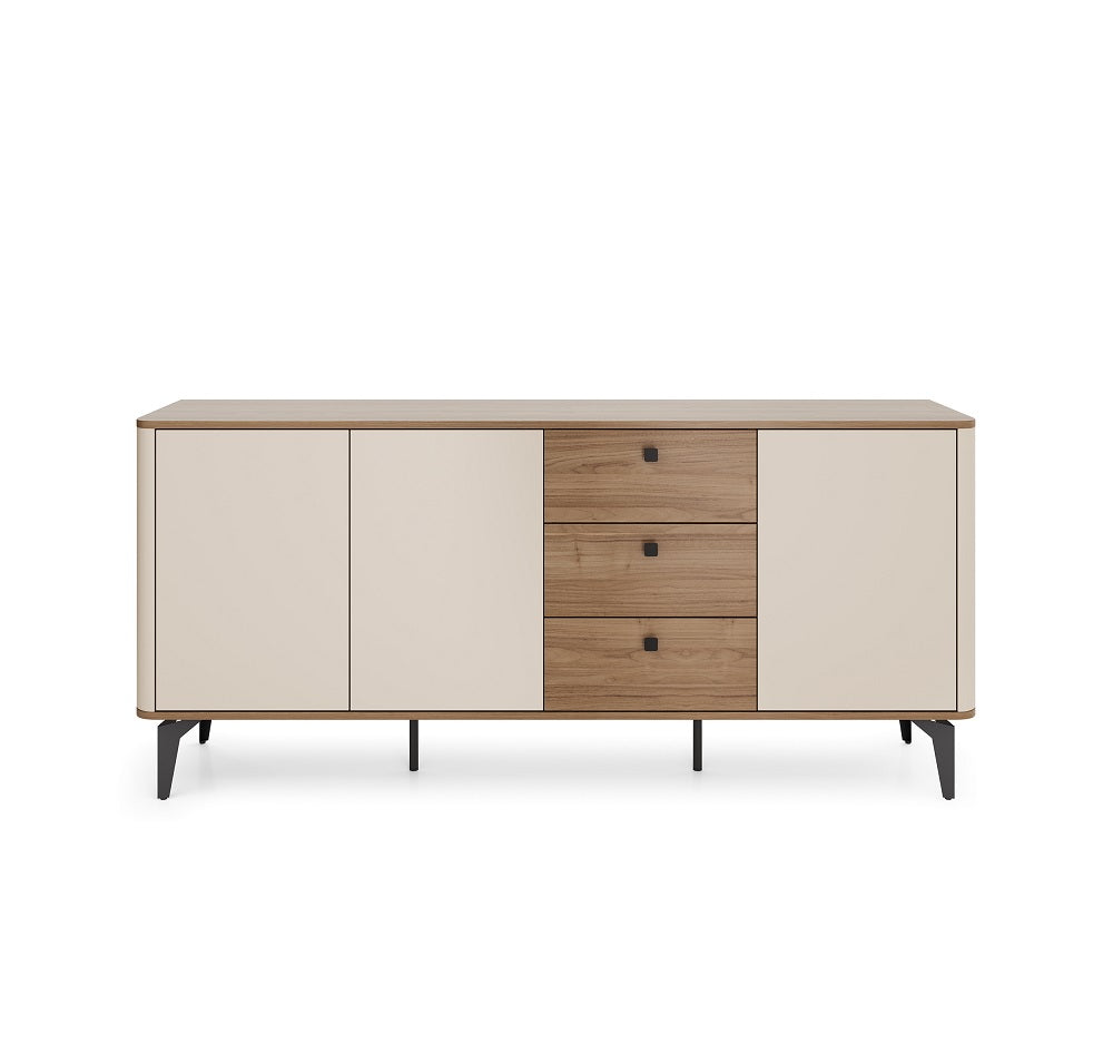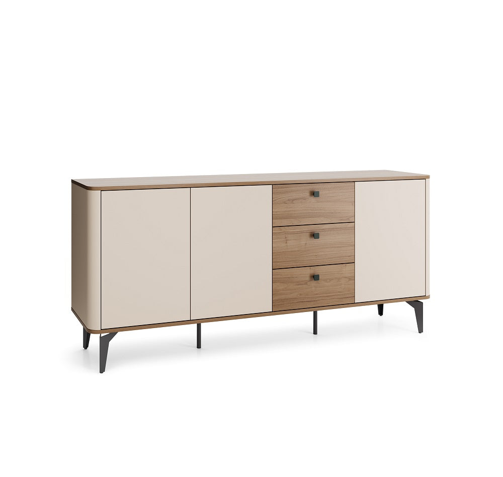 With three cupboards and three central drawers, this sideboard offers generous storage capacity for tableware, accessories and everyday essentials. Its wide top surface provides additional space for decorative items, lighting or practical use in daily life.