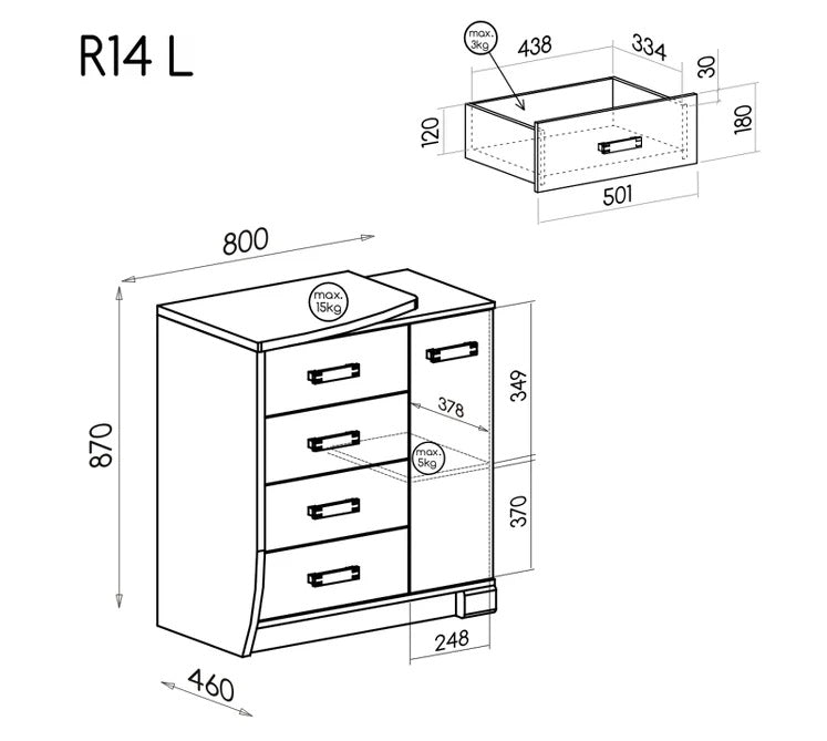 The Romero R14 features four spacious drawers and an additional shelf, providing convenient storage for clothing, accessories, documents, or everyday household items. It works perfectly as a standalone piece or combined with other furniture from the Romero collection to create a cohesive interior arrangement.