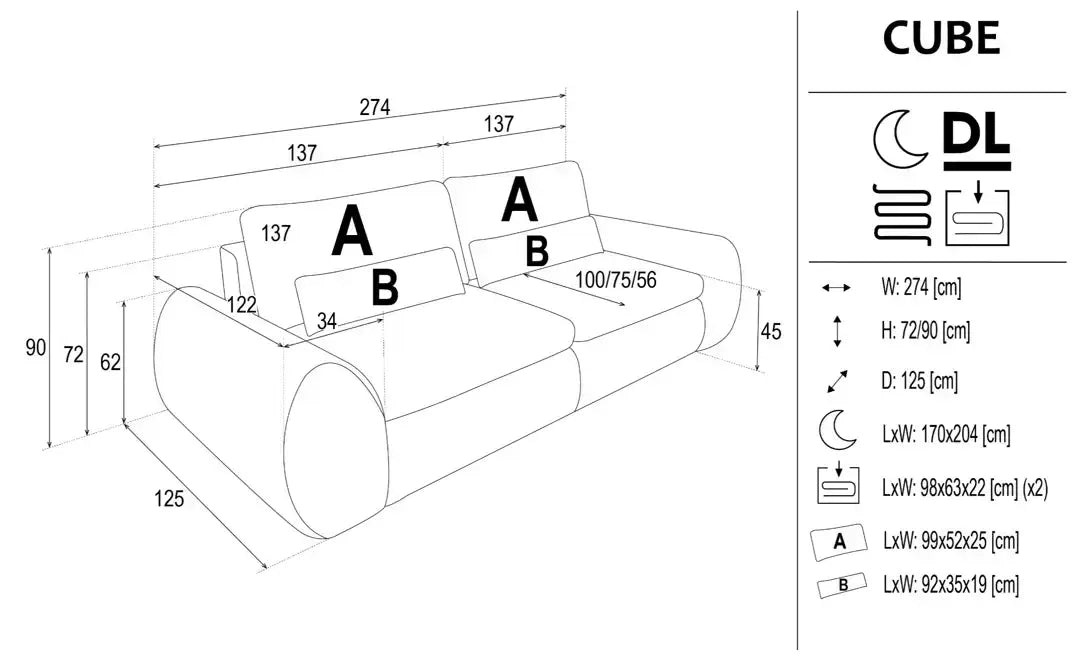 Designed for modern UK interiors that value generous proportions and everyday practicality, the Cube Big sofa bed offers a bold, comfortable solution for spacious living rooms. Its wide seating area, DL sleeping mechanism and double storage compartments make it ideal for daily relaxation as well as overnight use. Cube Big combines solid construction, soft cushioning and a calm, contemporary form that brings balance and functionality into the living space.