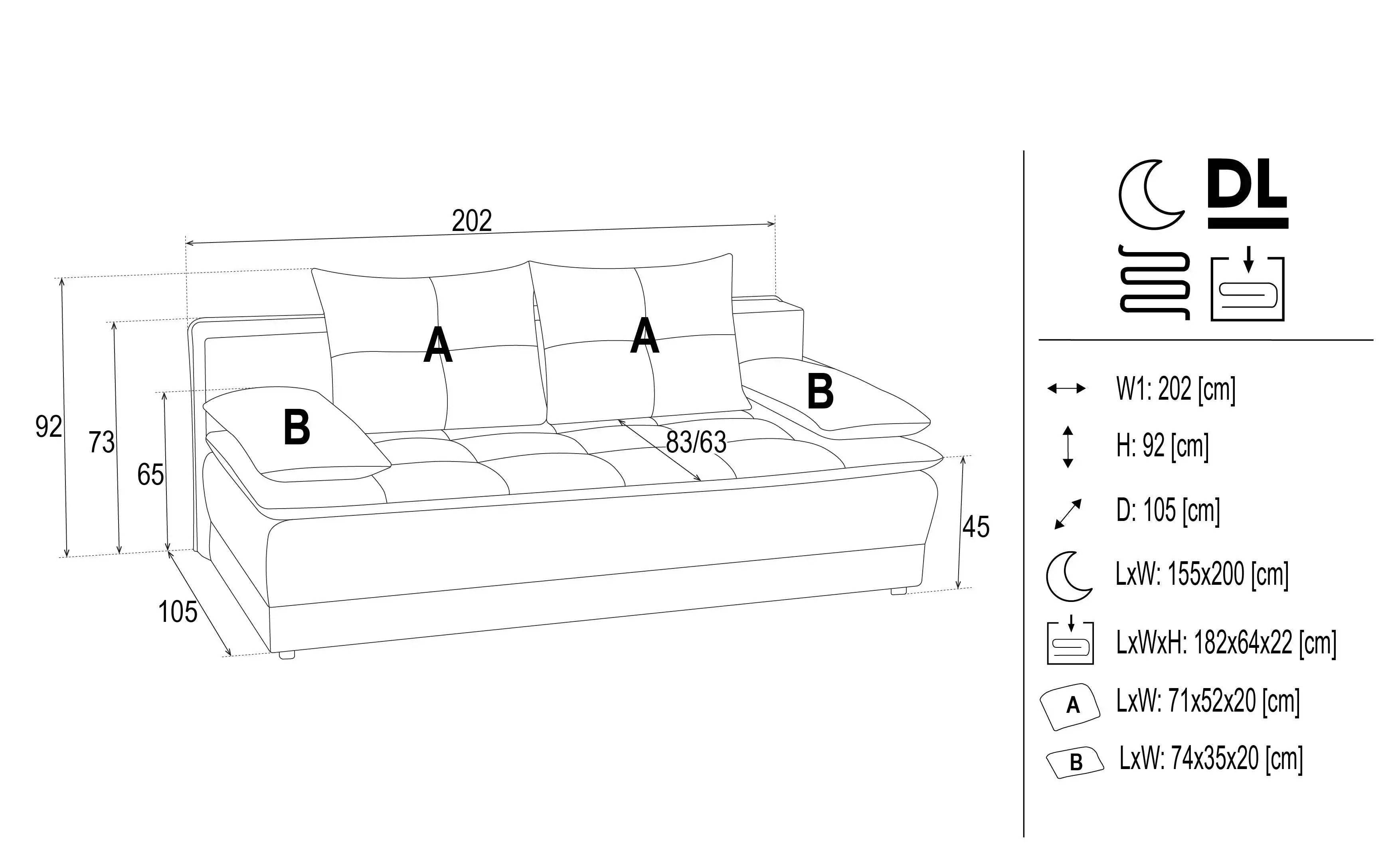 • Two seater sofa with integrated sofa bed function (DL mechanism)