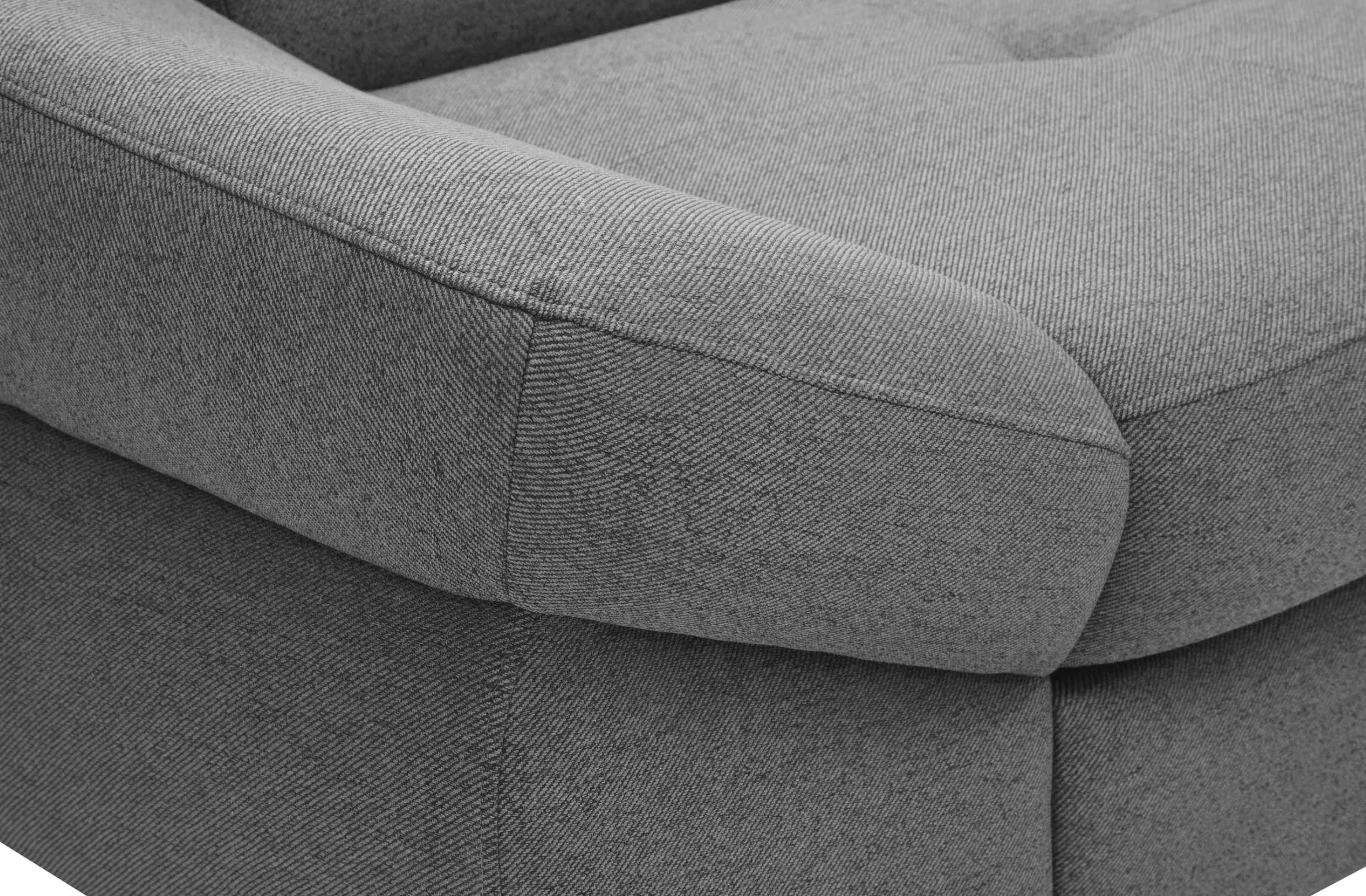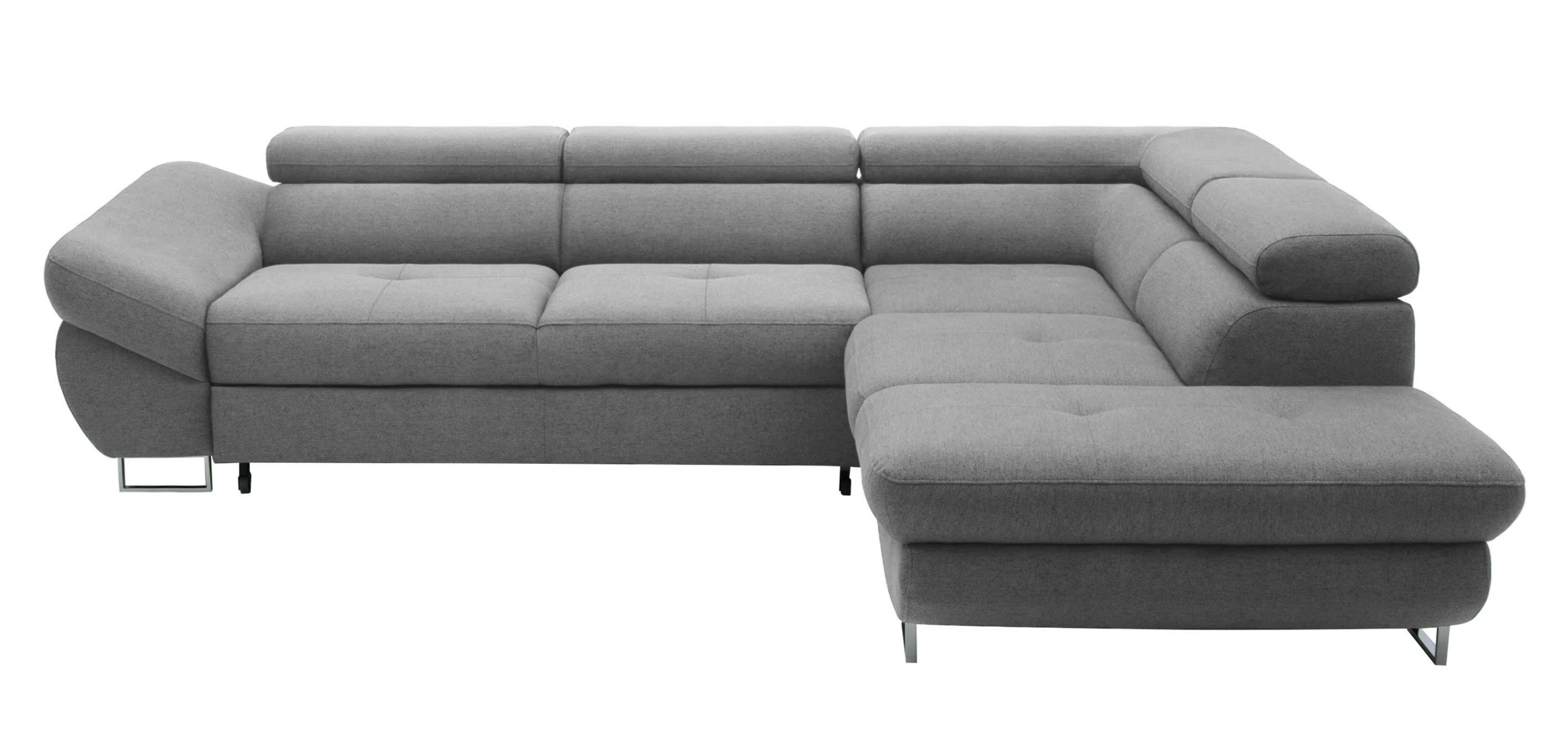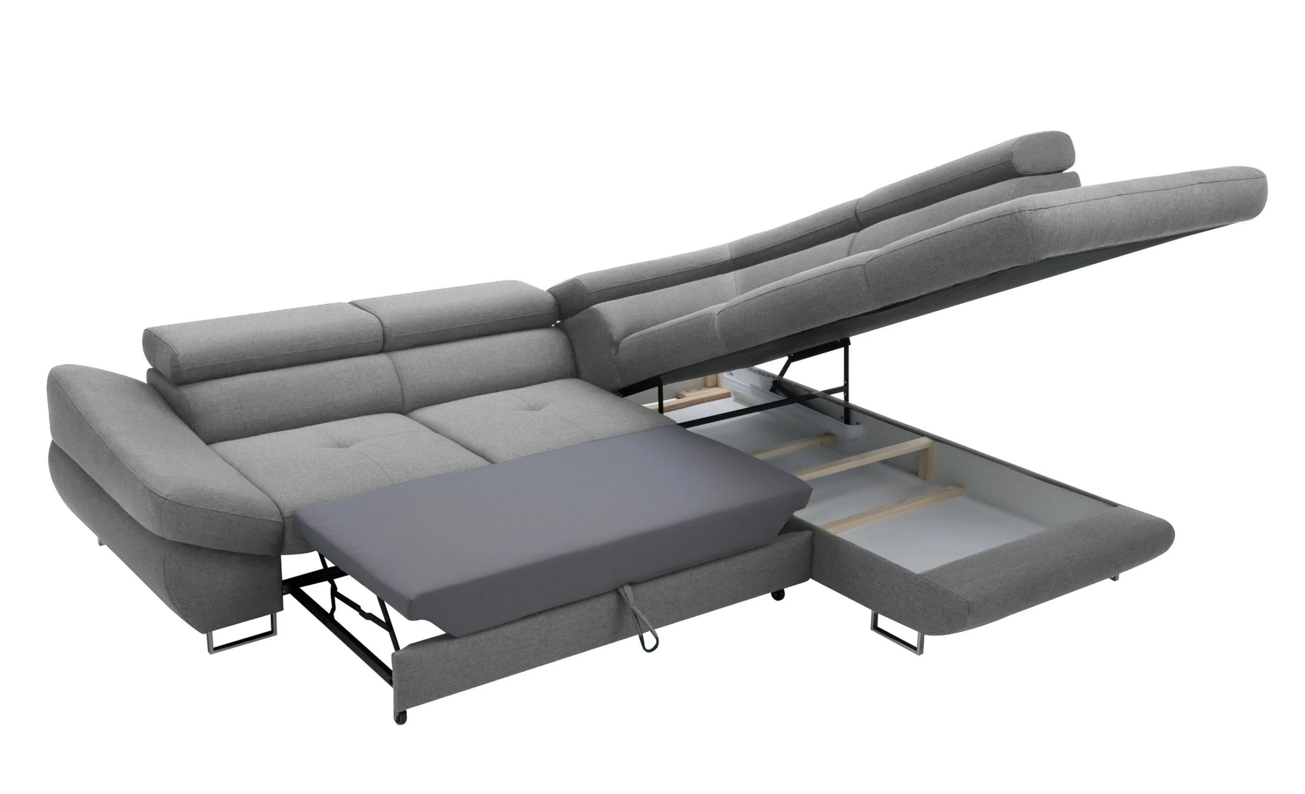 Dieses Ecksofa mit Bettkasten und Stauraum verfügt über ein integriertes Fach unter der Sitzfläche, ideal zur Aufbewahrung von Bettzeug, Kissen oder Decken. Das Sofa wird von einem stabilen Buchenholzrahmen und Metallbeinen getragen, während hochelastischer Schaumstoff und Zickzack-Federn für zuverlässigen Komfort sorgen. Verstellbare Kopfstützen ermöglichen eine individuelle Anpassung.