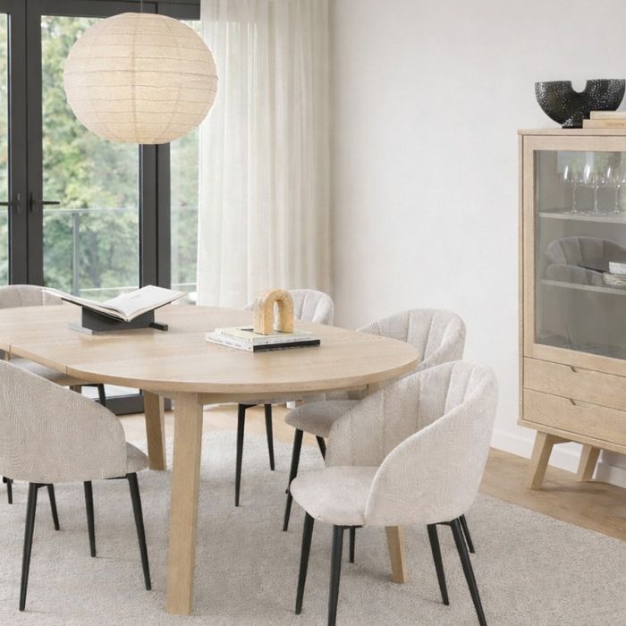 Finished in white pigmented oiled oak veneer, the leaves highlight the natural wood grain and provide a light, elegant appearance that brightens any dining space. Once installed, the table transforms from a compact round shape into a larger oval form, offering additional space for guests without compromising the design.