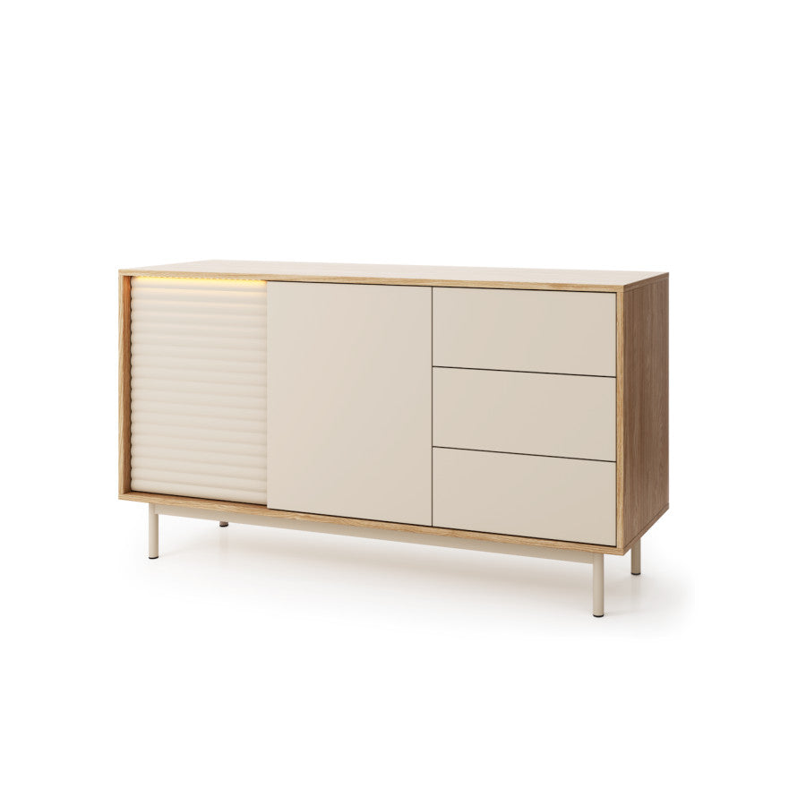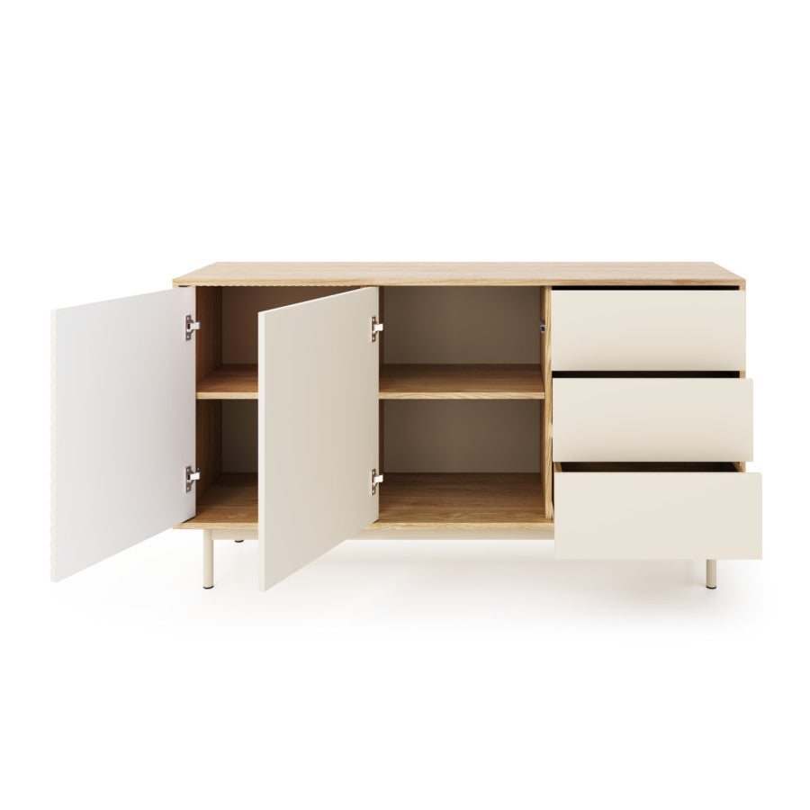 Odważna w wyglądzie, a jednocześnie dopracowana w szczegółach, szafka Lamelo Sideboard 178 prezentuje smukłą sylwetkę z bogatą fakturą drewna i nowoczesnymi liniami. Szerokość 178 cm zapewnia dużo miejsca do przechowywania, dodając jednocześnie nowoczesnego akcentu do każdej jadalni lub salonu.