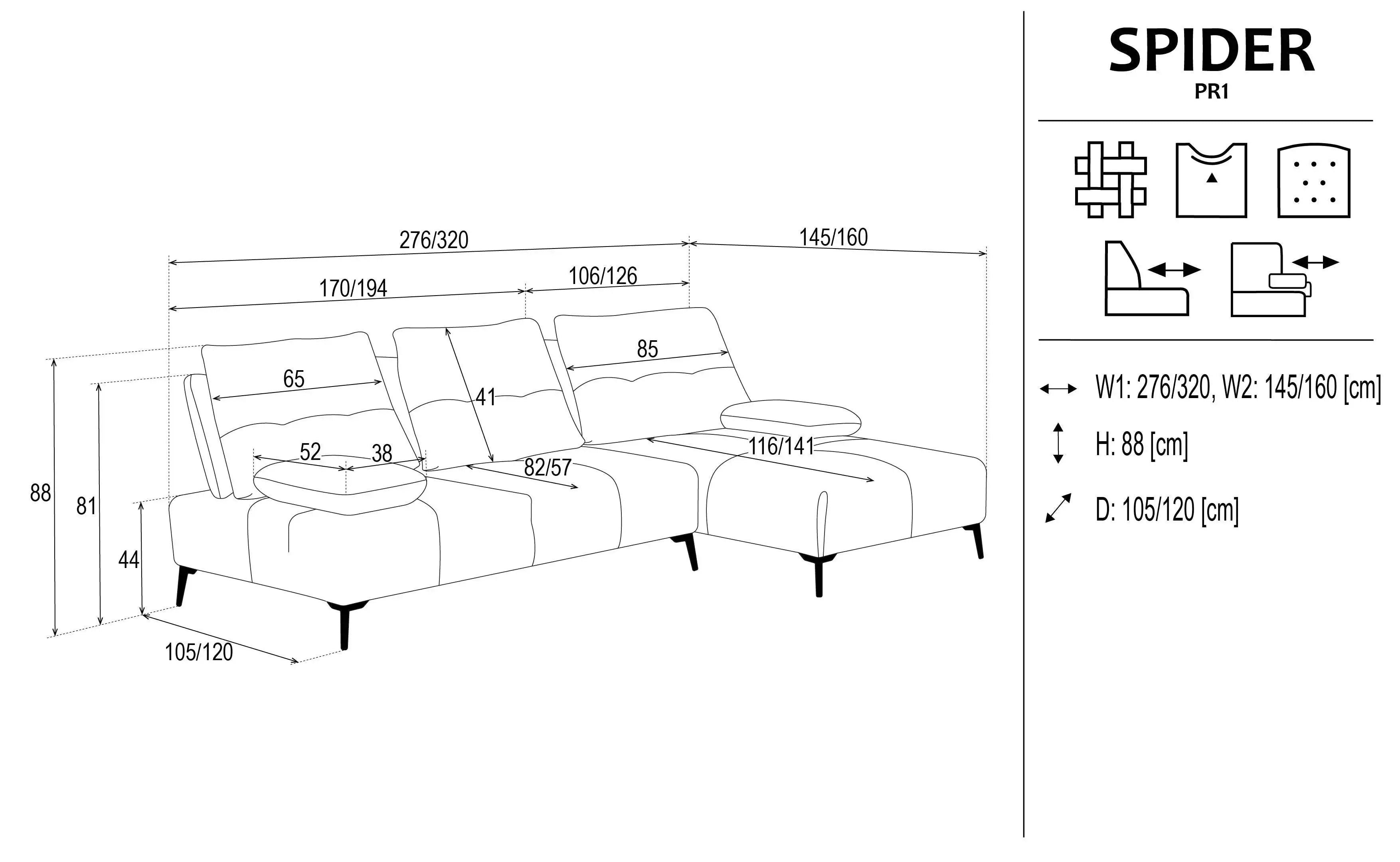 Sofa narożna Spider 1 oferuje stylowy komfort dzięki regulowanemu oparciu. Solidne metalowe nogi i rama z drewna bukowego zapewniają trwałość. Wysoce elastyczna pianka i wypełnienie Zigzag Springs zapewniają maksymalne wsparcie, a podłokietniki z pianki zapewniają dodatkowy komfort. Dostępna w różnych tkaninach obiciowych.