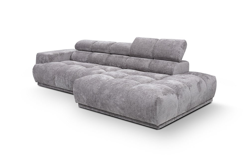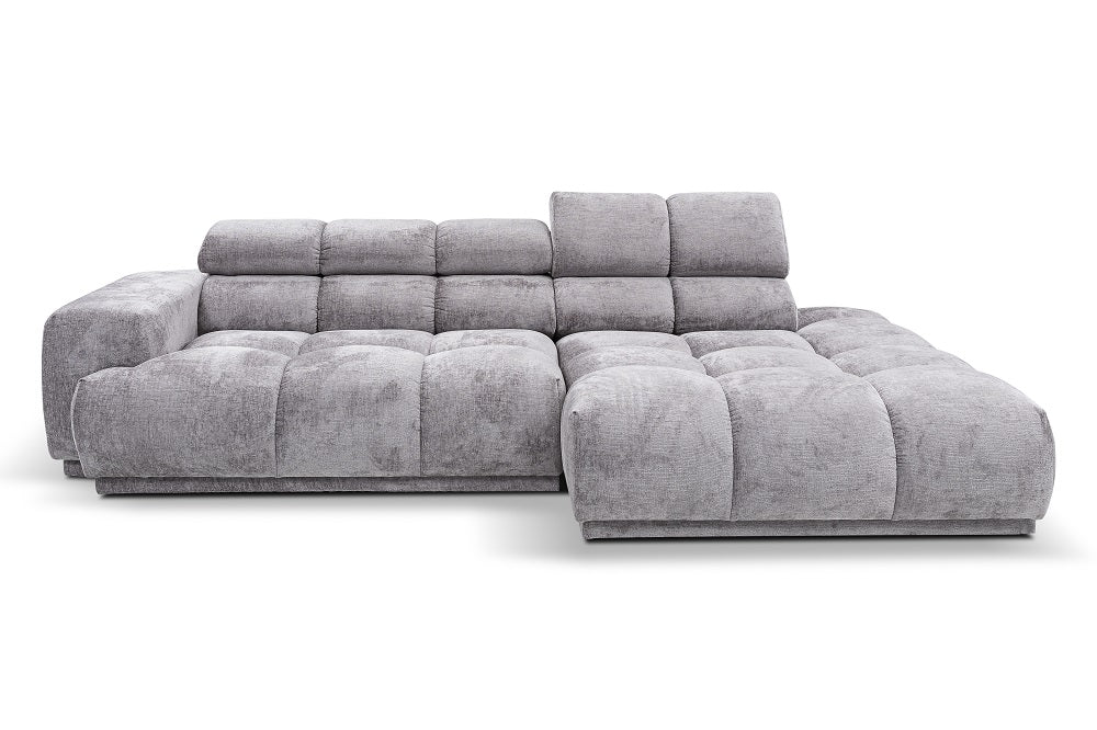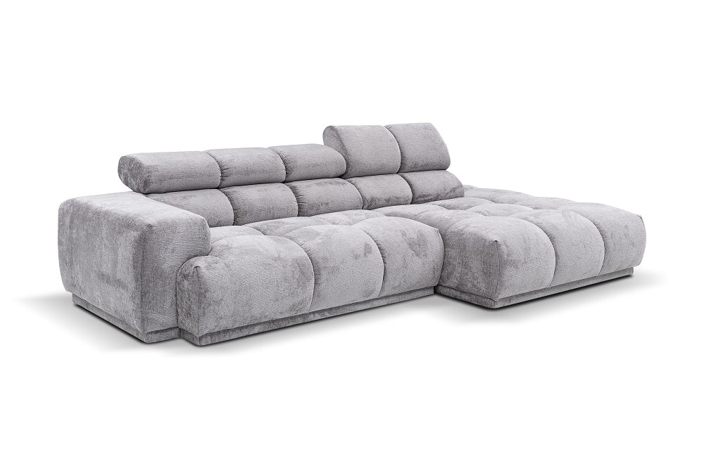 Sofa narożna Chani PR3 oferuje komfort dostosowany do indywidualnych potrzeb dzięki różnorodności tkanin tapicerskich, które dopasujesz do swojego stylu. Wykonana z wytrzymałej konstrukcji z drewna sosnowego, wyposażona jest w wysokoelastyczną piankę i szelki tapicerskie zapewniające trwałe podparcie. Plastikowe nóżki gwarantują trwałość, a dwa regulowane zagłębnik zapewniają spersonalizowany relaks. Jej przestronne wymiary — 280 cm szerokości, 150 cm długości i 71/86 cm wysokości — oraz głębokość siedziska wynosząca 66 cm sprawiają, że jest idealnym centralnym elementem Twojej przestrzeni salonowej.