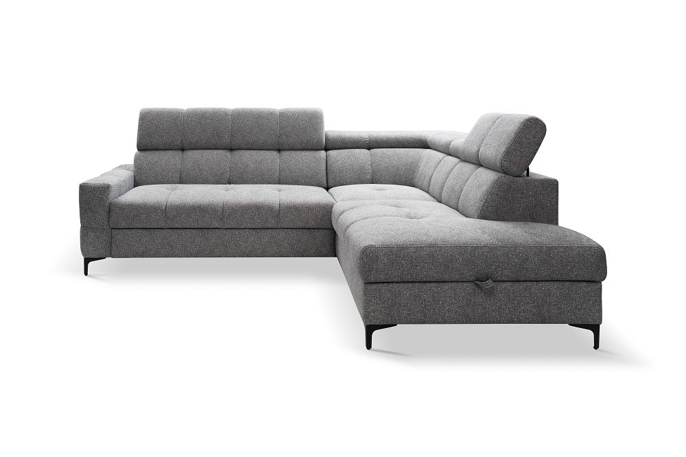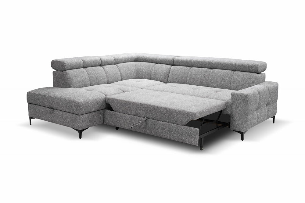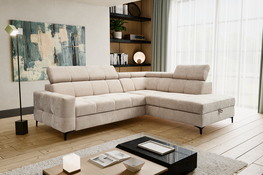 The Leno Corner Sofa Bed with Storage combines comfort and practicality, featuring a sleeping function and two adjustable headrests for personalized relaxation. Its sturdy beech and pine wood frame supports highly elastic foam seating with zigzag springs, offering lasting comfort. A spacious container under the seating provides convenient storage for bedding. The sofa rests on durable metal and plastic legs and is available in a variety of upholstery fabrics to suit your style. With dimensions designed to fit comfortably in your living space, it offers a generous 127 cm x 185 cm sleeping area for restful nights.