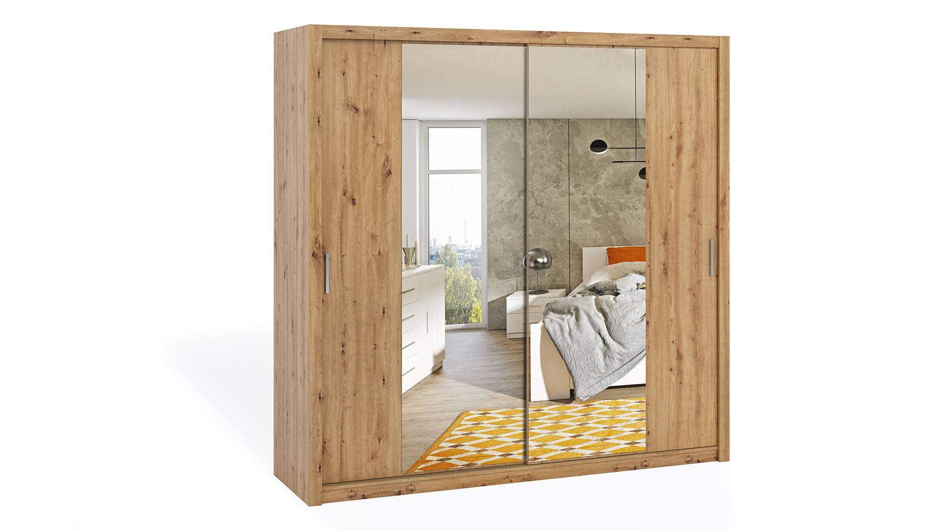 Bono Wardrobe w/ Mirror 220 to przestronne i nowoczesne rozwiązanie do przechowywania zaprojektowane tak, aby utrzymać porządek w sypialni. Posiada dwoje przesuwanych drzwi i zapewnia łatwy dostęp do wnętrza, które obejmuje dziewięć półek, dwa drążki na wieszaki i lustra na całej długości.