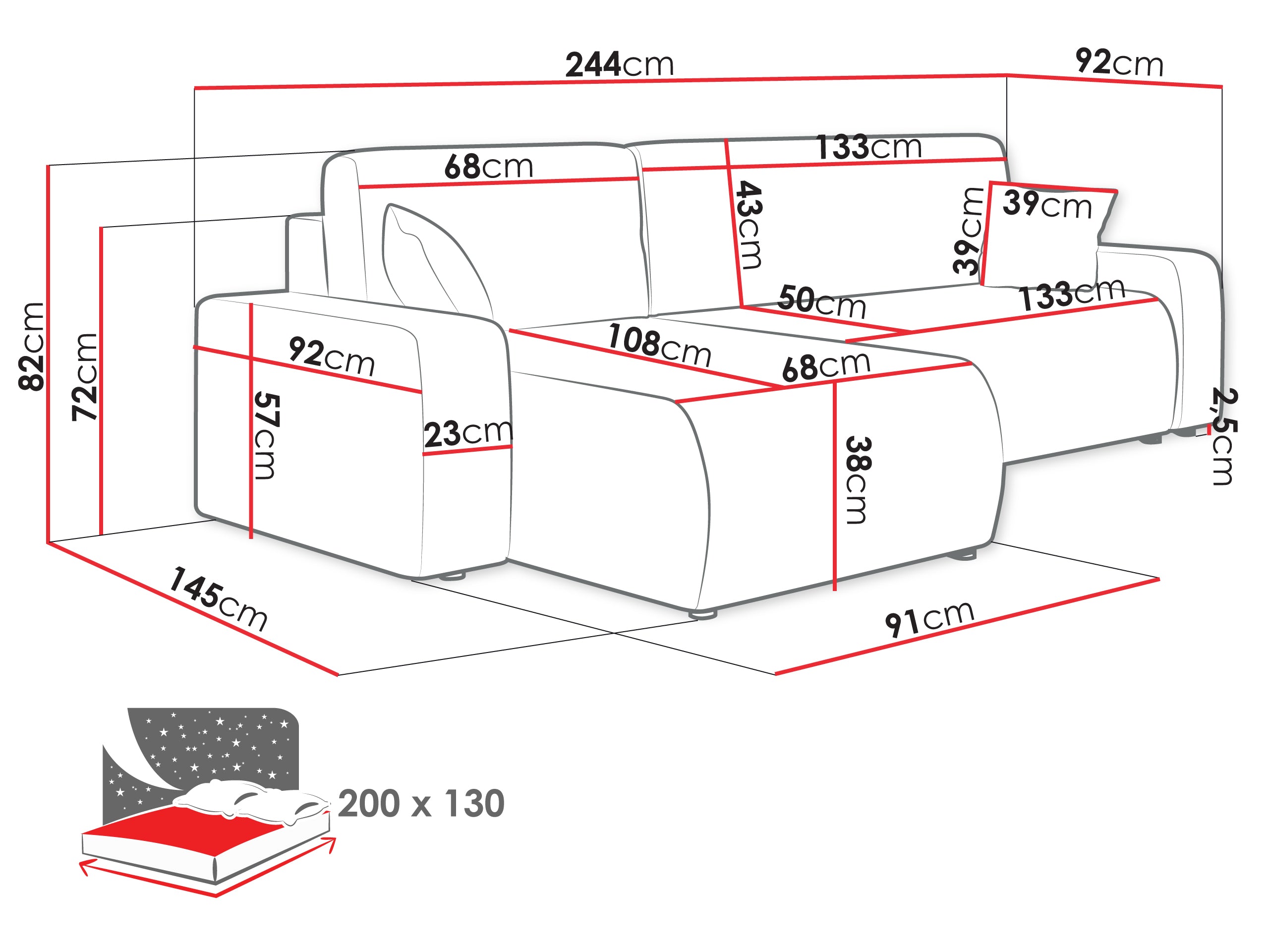 Miękkie, wspierające poduszki i wysokiej jakości tapicerka zapewniają pluszowe wrażenia z siedzenia, a eleganckie linie i neutralne odcienie pozwalają na bezproblemowe dopasowanie do różnych dekoracji domowych. Niezależnie od tego, czy przyjmujesz gości, czy cieszysz się spokojnym wieczorem, narożna sofa Piano L Corner Sofa Bed wnosi styl i wygodę do Twojej przestrzeni życiowej.